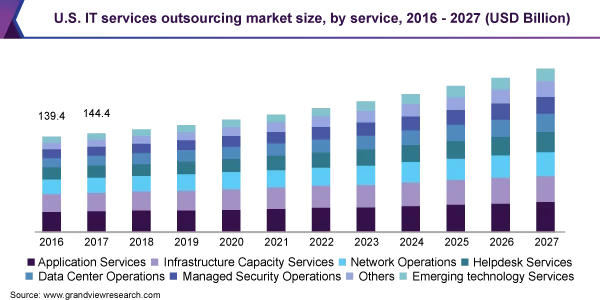 The global IT services outsourcing market, worth USD 520.74 billion in 2019, is projected to experience a steady growth trajectory, boasting a compound annual growth rate (CAGR) of 7.7% from 2020 through 2027.