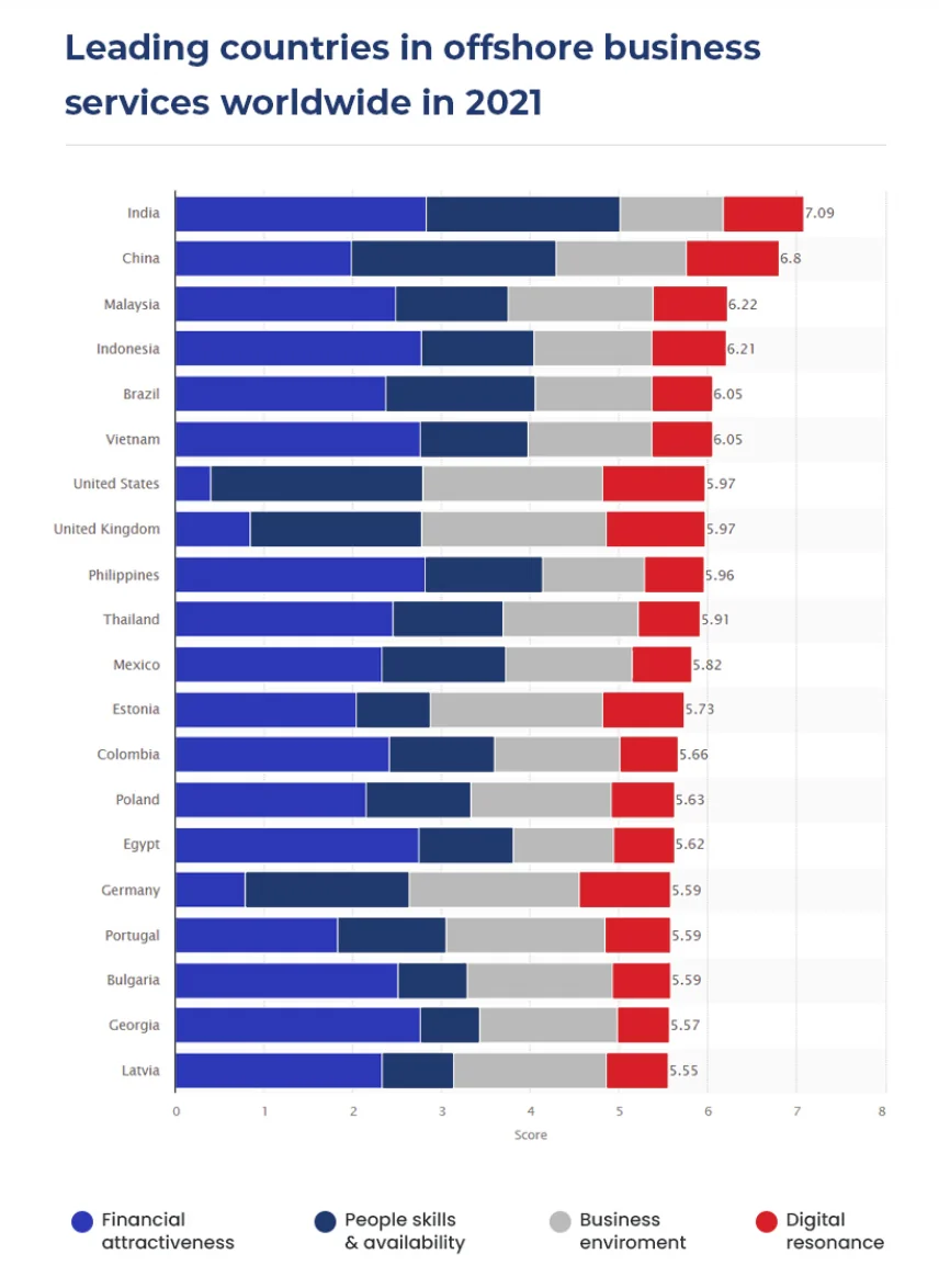When it comes to outsourcing, India undisputedly holds the top position. No other nation can rival the abundance of highly skilled professionals that India possesses. According to a recent report from Statista, India emerged as the leading global hub for offshore business services in 2021.