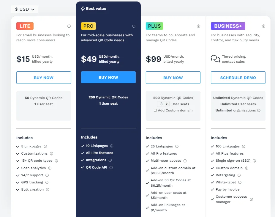 - Pro plan: At $49/month, this plan is suited for mid-scale businesses with advanced QR code needs. It includes all the features of the Lite plan along with 250 dynamic QR codes, 1 user seat, 10 Linkpages, extra integrations, and access to the QR code API.