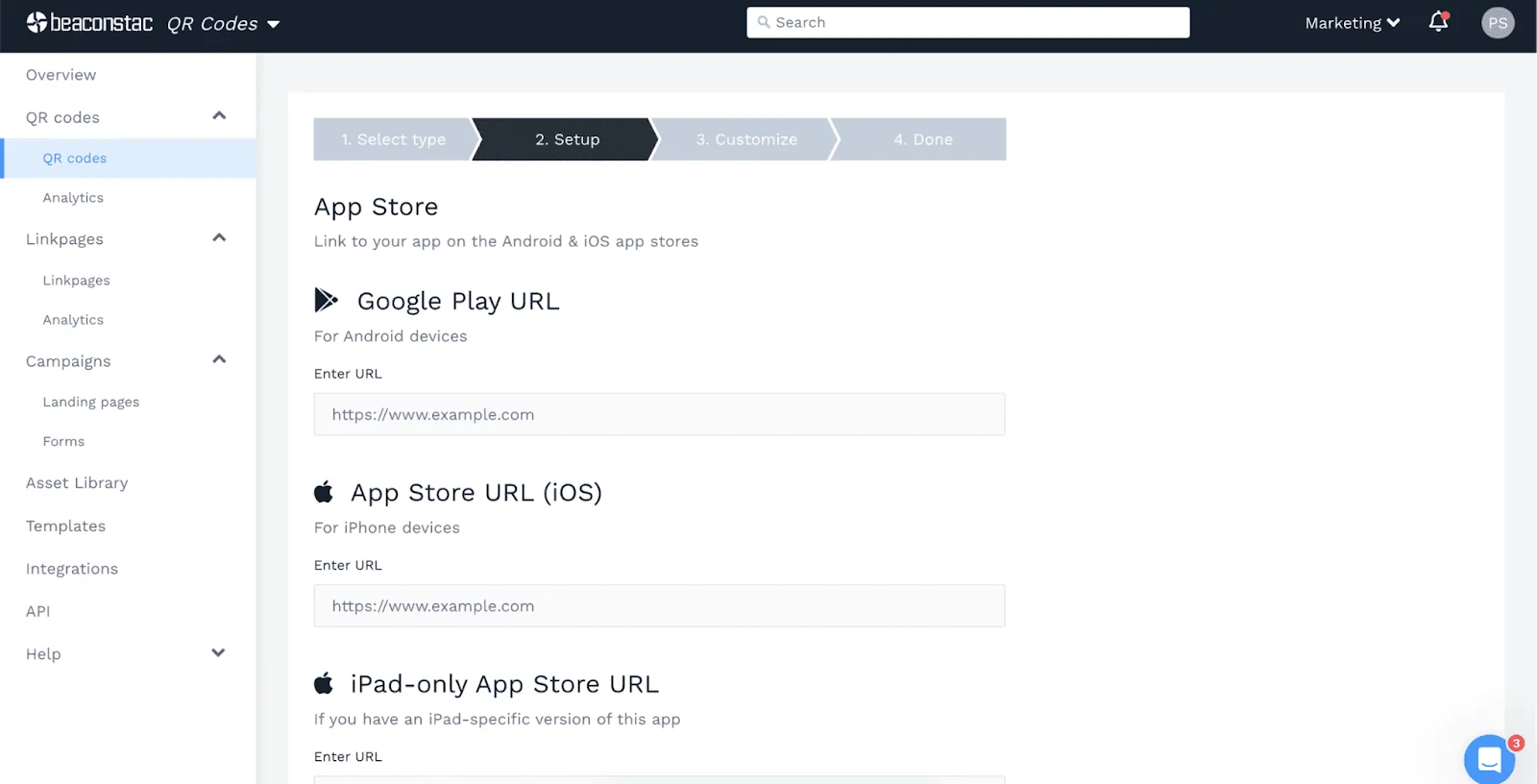 From here, choose the QR code campaign type that fits your needs. This could include a vCard QR Code for sharing contact information, a PDF QR Code for displaying the menu or product catalog, or a Play Store QR Code for app downloads. After selecting, fill in the relevant URLs and other details.