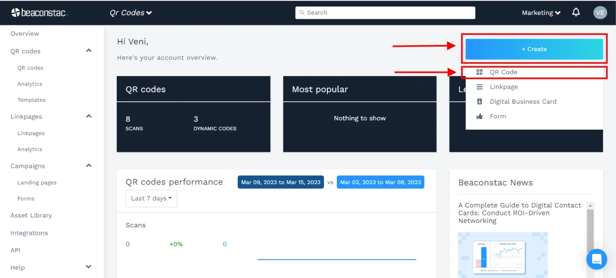 First, sign up for Uniqode’s 14-day free trial. After signing up, you will be taken to the dashboard. Click on ‘+Create’ on the right-hand side.